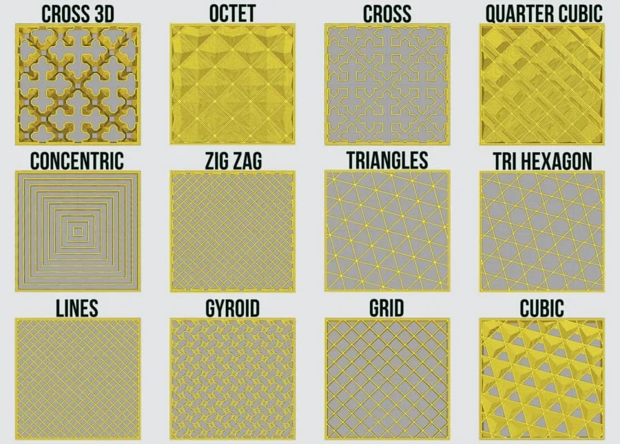 Basic types of infill patterns used in the 3D printing industry