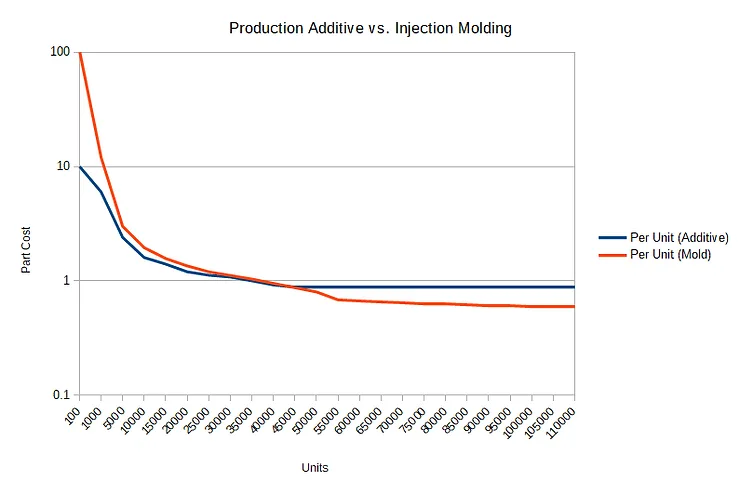 3D printing chart showing consistent cost per unit compared to injection molding. *Note: Exact cost per unit is dependent on the specific 3D printing material and technology used.
