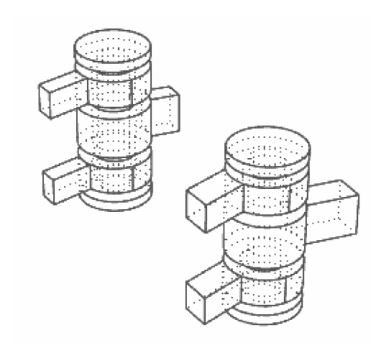 The other method is for a pin to extend from the inner rod and control the motion by being blocked within the rotating element. This is a more elegant solution in many ways because the pin is hidden and protected. However, there are a few drawbacks for 3D printing. First, it can be difficult to remove the excess powder in this scenario, so there must be a larger planned gap between the rotating element and the rod. If the gap is too loose, then the movement of the element will tend to “wobble”. This is a balance that must be determined by testing. Second, the pin is by definition smaller because it is inside the rotating element. This means that it has less overall strength and can be more easily snapped if there are higher mechanical pressures on the part.